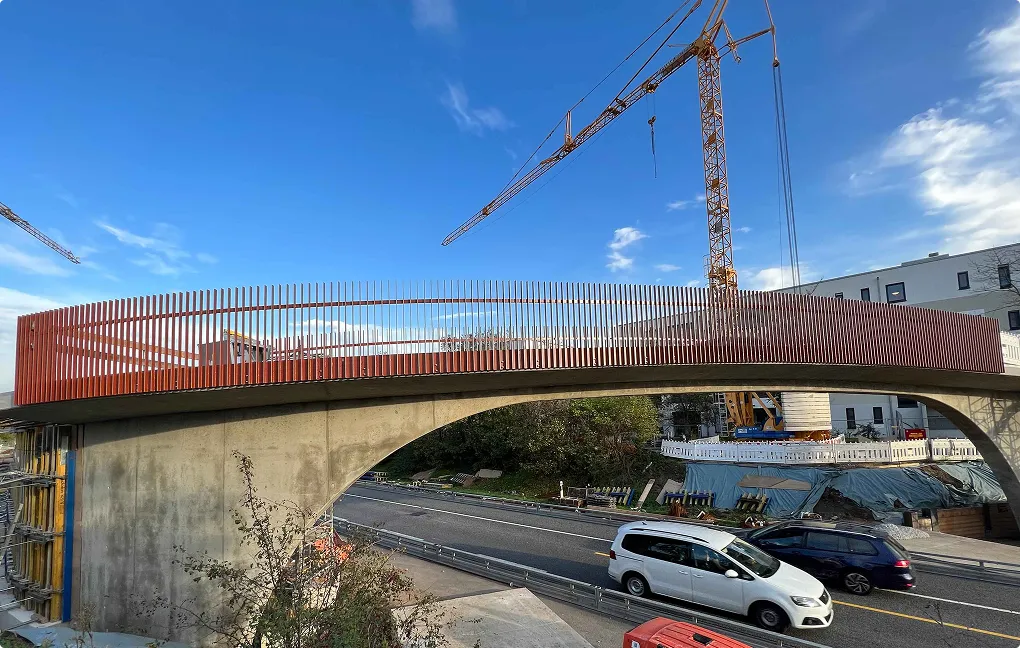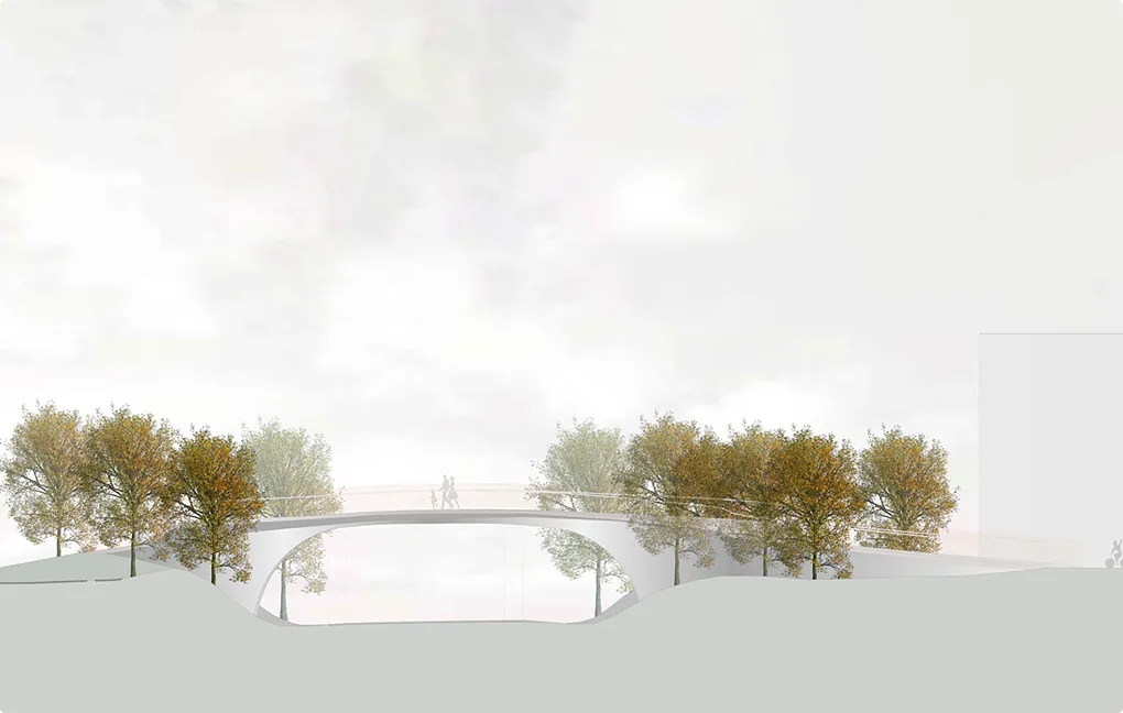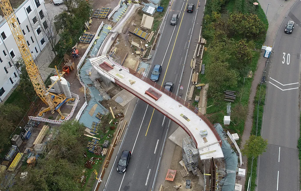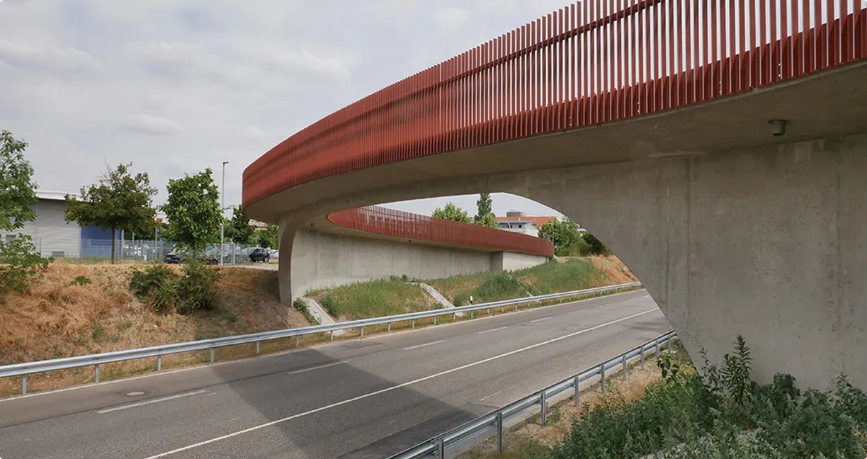 Die Gestaltung der Brücke setzt ein individuelles Zeichen ohne durch übertriebene konstruktive Gesten zu stören. Sie fügt sich selbstverständlich in den Straßenraum ein, ohne sich unterzuordnen. Die Kombination des geschwungenen blattartigen Tragwerkes, verbindet einerseits eine Bodenständigkeit im Böschungsbereich mit der Leichtigkeit über der Bundesstraße. Dieses Vexierspiel des Tragwerkes wird im Erscheinungsbild der zweifarbig changierenden Geländer fortgesetzt. Die Brücke verbindet die bestehenden und geplanten Fuß- und Radwege. Sie dient dem Verkehr innerhalb des Quartiers, aber auch der Verbindung zur Innenstadt. Der festgelegte Querschnitt der neuen Brücke sieht eine Gesamtnutzbreite zwischen den Geländern von 3,50 m als kombinierter Geh- und Radweg vor. In den Kurven weitet sich die Brückenbreite auf 4,00 m auf.