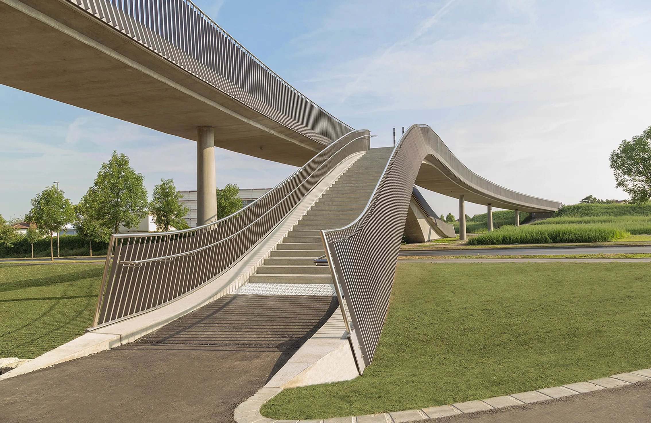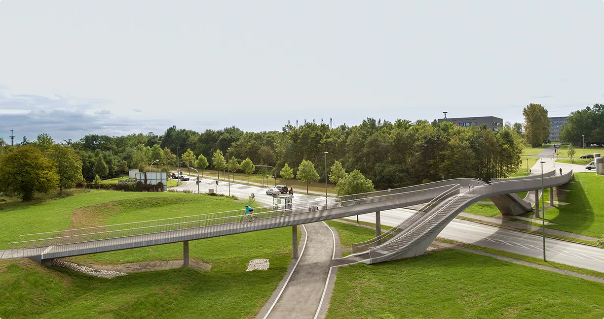 Bei dem, im Januar 2012 durchgeführten beschränkten Wettbewerb, wurde die vorliegende Brückenvariante für die Ausführung bestimmt. Das Brückenbauwerk überspannt die Straße am Galgenberg als versetztes Bogentragwerk und führt über die begleitenden Grünstreifen in Form von schlanken Bändern als Durchlaufträger. Sie nimmt in Ihrer Ausformung als versetztes Bogentragwerk, das sich aus zwei Bändern zusammenfügt, die Thematik des städtebaulichen Leitbildes „grünes Band“ auf und wird in ihrer Zeichenhaftigkeit mit Würzburg und dem Hubland Campus der Universität verbunden. Die Brücke verbindet die bestehenden und geplanten Fuß- und Radwege der beiden Teile des Hublandcampus. Sie dient vorwiegend dem Verkehr innerhalb des Universitätscampus sowie der Aufnahme des Zielverkehrs für Fußgänger und Radfahrer. Über Treppenabgänge werden die Haltestellen des ÖPNV und die überörtlichen Fuß- und Radwege entlang der Straße am Galgenberg angebunden. Der Überbau wurde als semiintegrale Stahlbetonkonstruktion ausgeführt, die Rampen sind als Durchlaufträger ausge-bildet. Die südliche Rampe gliedert sich in fünf Felder, die nördliche Rampe weist vier Felder auf. Beide Rampen schließen monolithisch an das Bogenmittelteil an. Der Bogen selbst besteht aus dem Mittelteil und versetzt angeordneten Treppenaufgängen, die Bogenspannweite beträgt ca. 34,00 m bei einem Bogenstich von ca. 5,50 m. Im Rampenbereich und im Mittelteil des Bogens hat die Platte eine Dicke von 45 cm. Die Treppenaufgänge sind durch eine veränderliche Voute gekennzeichnet, deren Höhe zum Widerlager hin deutlich zunimmt. Das heißt, bei gleichbleibender Neigung der Voute verringert sich deren untere Breite zum