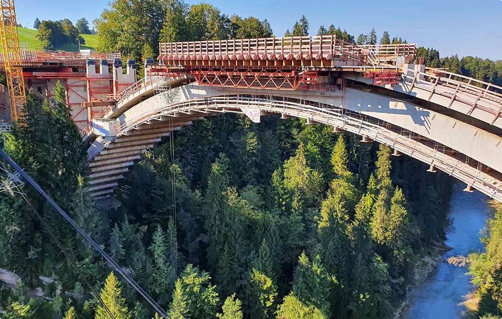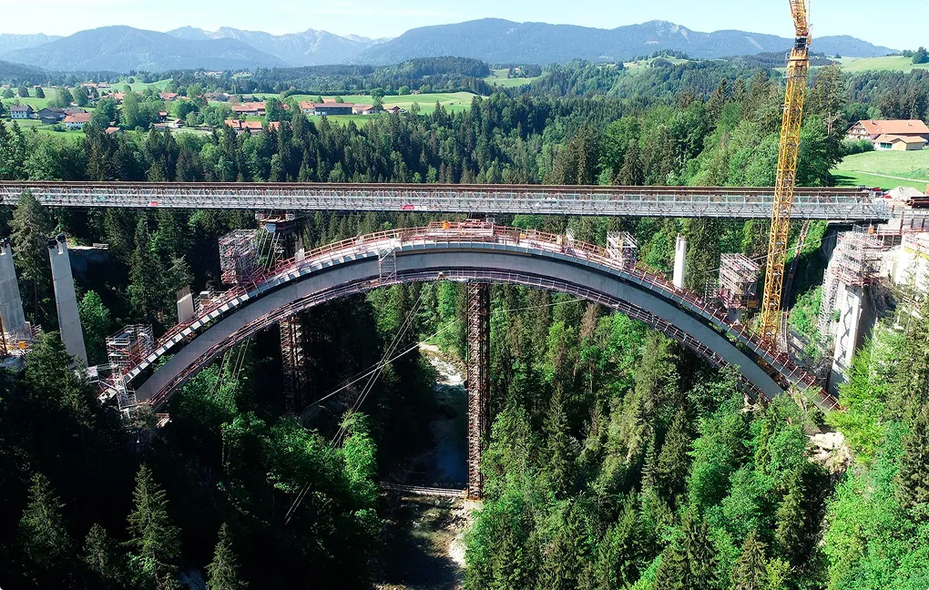 Die ursprüngliche Echelsbacher Brücke wurde 1928 erbaut. Die Bögen in Melanbauweise stehen unter Denkmalschutz und sind die größten ihrer Art weltweit. Im Zuge der 2014 beschlossenen Sanierung sollte ein neues Brückenbauwerk entstehen. Die Überbauten und Pfeiler der alten Brücke wurden abgebrochen, die beiden Bestandsbögen blieben jedoch erhalten und wurden saniert, sind aber nicht Teil des neuen Tragwerks. Der Bogen der neuen Brücke wird mit einem äußerst schlanken Gewölbebogen über den bestehenden Bögen errichtet. Die alten Bögen dienten als Traggerüst.