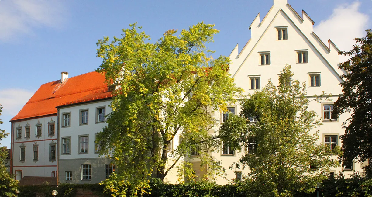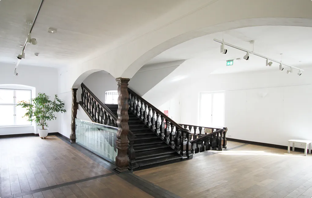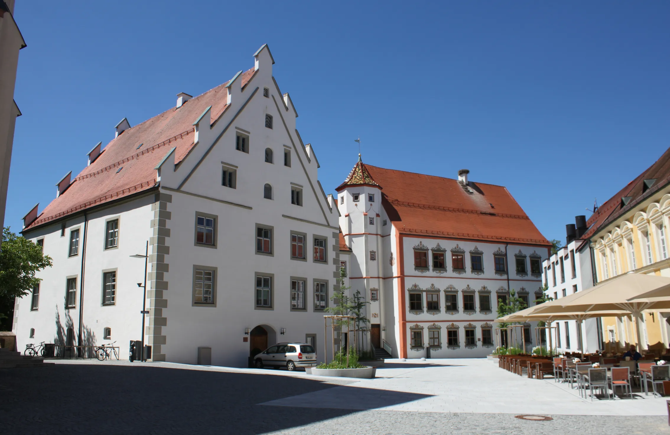 Fuggerschloss Im 2. Obergeschoss sollte ein ehemals über die gesamte Gebäudebreite vorhandener Saal zur künftigen Nutzung als „Großer Sitzungssaal“ wiederhergestellt werden. Zur Aufhängung der zwischenzeitlich auf später eingebauten Zwischenwänden aufliegenden Bundbalkenlage wurde ein im Dachraum vorhandenes, wie die statische Nachrechnung gezeigt hatte, aber zu schwach ausgebildetes Hängewerk an den Knotenpunkten verstärkt und reaktiviert, sodass der Gesamteindruck des historisch gewachsenen Dachwerks unverändert erhalten bleiben und dennoch der große Sitzungssaal realisiert werden konnte. Im EG des Fuggerschlosses wurde ein ehemals vorhandener Raum durch eine tragende Wand geteilt. Der Wunsch des Architekten, die noch vorhandene, durchgängige Holzbalkendecke wieder sichtbar zu machen, wurde durch den Einbau einer filigran ausgebildeten, tragenden Stahl-Glas-Konstruktion realisiert.
