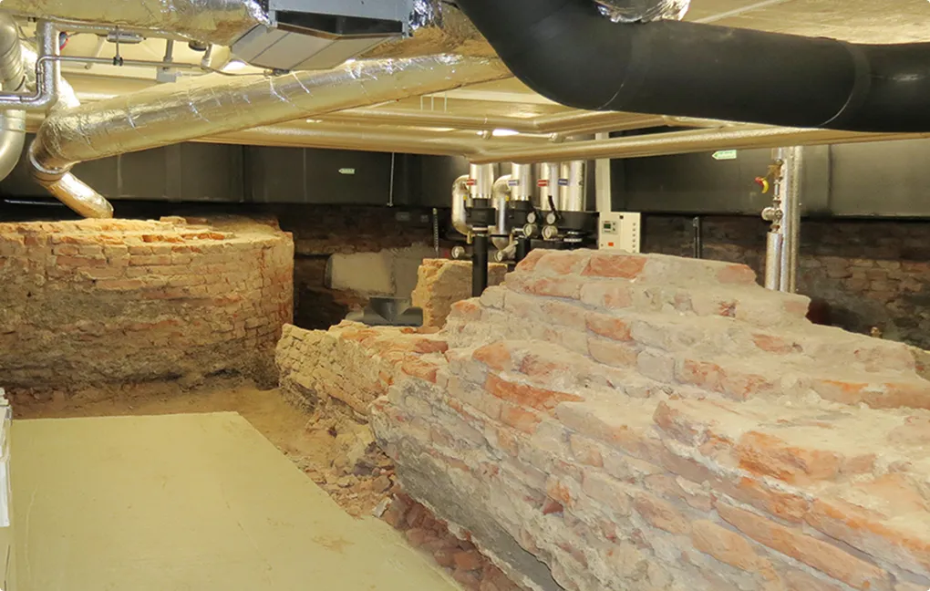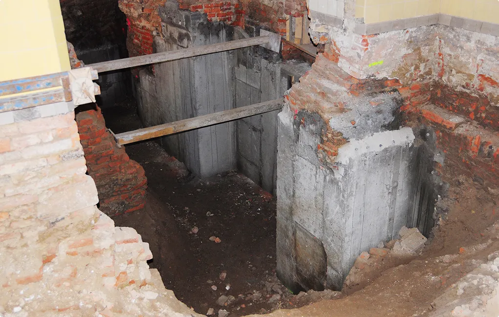 Zur Unterbringung der Technikzentrale war wie im Neuffenschloss auch hier die Erstellung von zusätzlichen Kellerräumen unter dem Zwischenbau vorgesehenen. Aufgrund von hier nach Vorsondierungen vermuteten Fundamentresten eines Vorgängerbaus musste die Erstellung der Kellerräume abschnittweise in enger Abstimmung mit der Bodendenkmalpflege erfolgen. Auch hier wurde die Unterfangung im Pilgerschrittverfahren durchgeführt. Aufgrund der Unterfangungstiefen von ca. 4 m waren hier zwei Abschnitte von je 2 m Tiefe geplant. Das abschnittsweise Vorgehen beim Aushub machte das parallele Arbeiten von Baufirma und Archäologen ohne nennenswerte Verzögerungen der Bauzeit möglich.