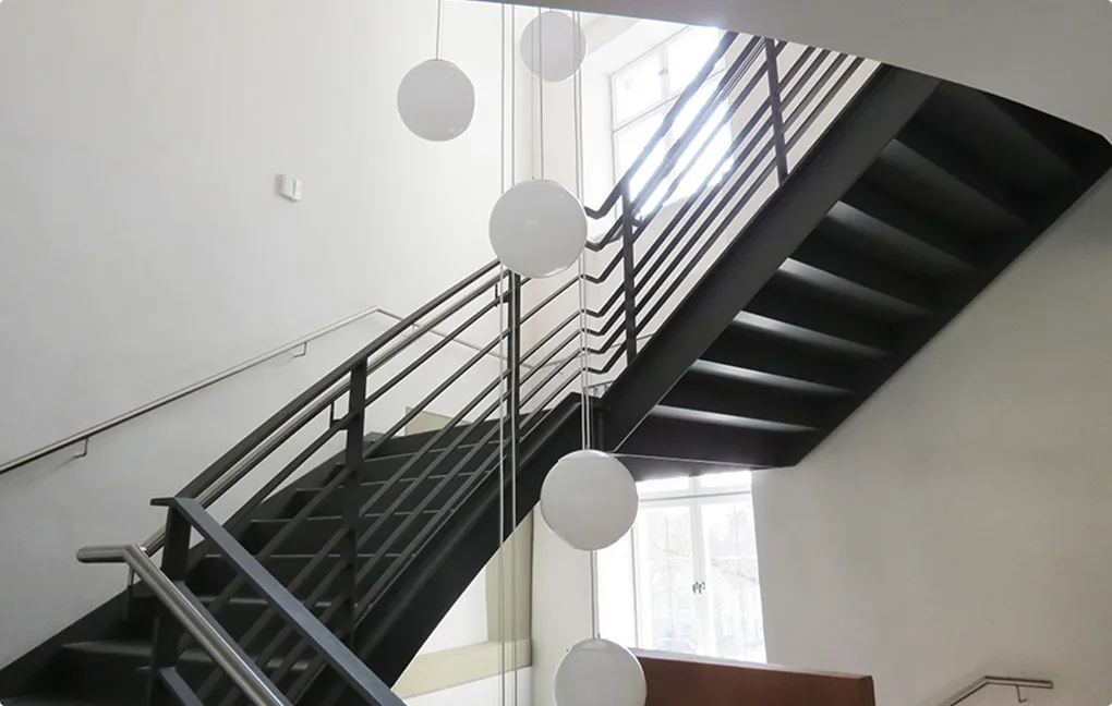 Aufgrund der hohen Verkehrslasten im Bereich der Zugangsflächen und der Lasten aus dem im Dachraum untergebrachten Archives wurde hier eine zusätzliche Stahlkonstruktion mit zwei über die Geschosse durchlaufenden Rundstützen zur Unterstützung der Deckenbalkenlagen erforderlich. Bei der Planung der Stützkonstruktion wurde die vorhandene starke Durchbiegung der Deckenbalkenlage von mehr als 20 cm ausgenutzt. Anstelle von sichtbaren Unterzügen unterhalb der Deckenbalkenlage wurden Überzüge eingebaut, an die die Deckenbalken angehängt wurden. Die Überzüge konnten wegen des Deckendurchhangs komplett im neuen Deckenaufbau integriert werden.
