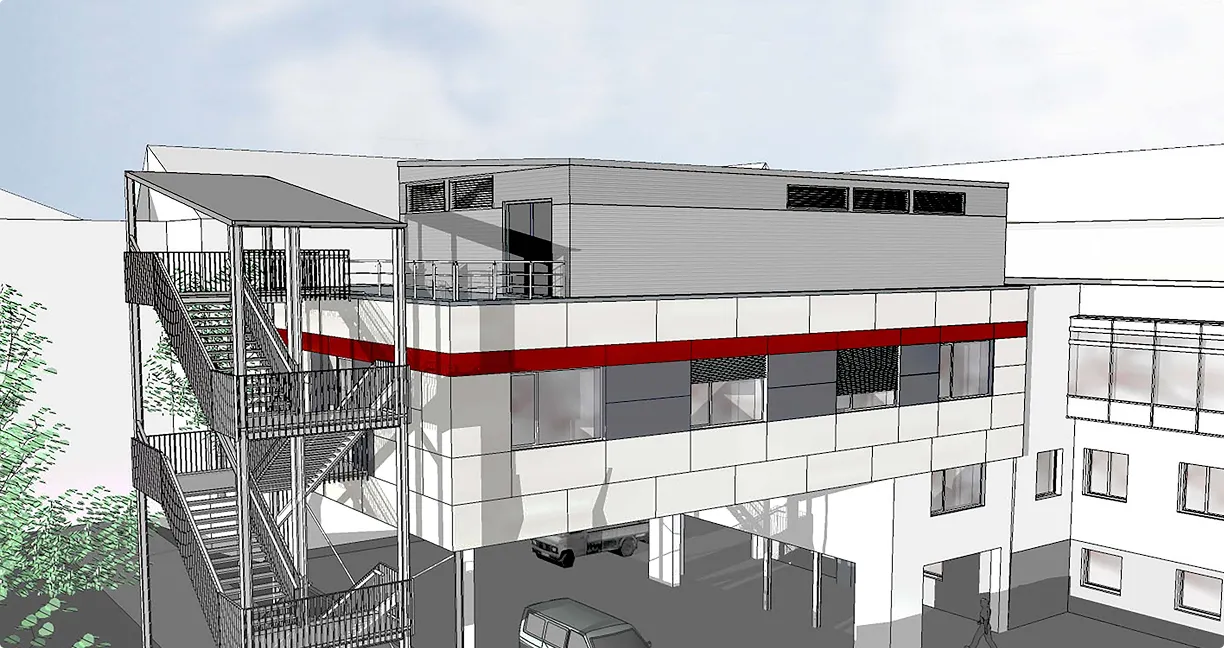 Die Arbeiten wurden bei laufendem Klinikbetrieb umgesetzt. Eine besondere Herausforderung bestand darin, direkt neben dem Bestandbau zu gründen und die Lasten so aufzubringen, dass der Bestand rissefrei blieb und Differenzsetzungen vermieden werden. Die Fugen zum Bestand wurden so ausgelegt, dass sie mit gängigen Fugenkonstruktionen ausgebildet werden konnten.