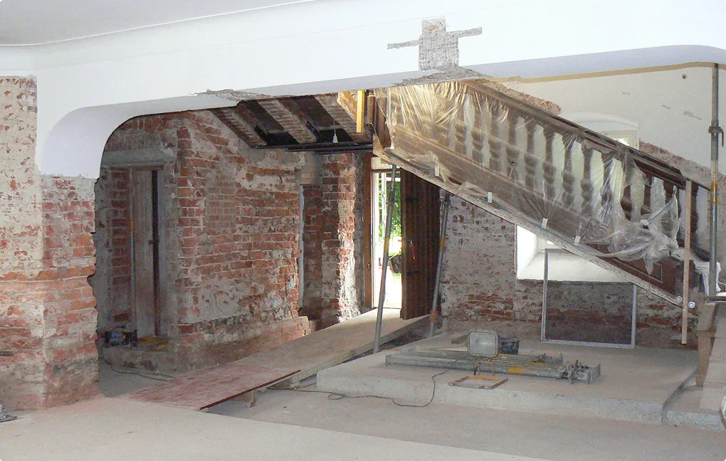 Projektbeschreibung: Der Ende des 18. Jahrhunderts errichtete und später erweiterte dreigeschossige Ziegelbau mit Walmdach wurde in den Jahren 2006 bis 2009 statisch untersucht und anschließend im Rahmen einer Gesamtinstandsetzung auch statisch saniert. In einem ersten Schritt erfolgte eine Bestands - bzw. Schadensaufnahme des Dachtragwerks, Treppentragwerks sowie des Mauerwerks. Zur Beurteilung der Holzbalkendecken wurden Erschütterungsmessungen durchgeführt. Die statische Nachrechnung des Dachtragwerks erfolgte anhand eines räumlichen Gesamtmodels. Im Zuge einer früheren Umbaumaßnahme wurde im Erdgeschoß ein Teil der tragendenden Mittelwand entfernt, die darüber liegenden Wände wurden ü