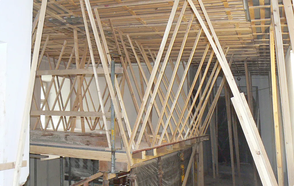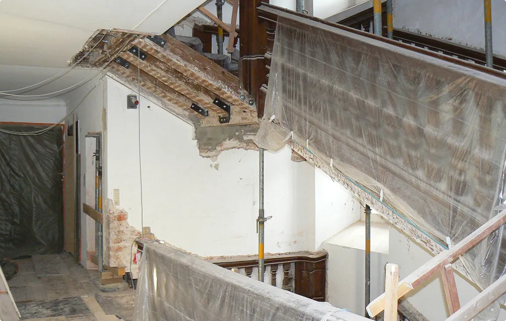 ber Zugbänder und Hängewerke in den Dachstuhl hochgehängt. Zur Beurteilung dieser Umbaumaßnahme und der derzeitigen Tragwirkung wurde das Gesamtsystem um die über dem Durchbruch stehende Wand- und die Deckenbalken im Treppenhausbereich erweitert. Im Anschluss erfolgten Entwurfs- und Ausführungsplanungen für die Instandsetzungsmaßnahmen am Dachstuhl, am Hängewerk und für die Treppeninstandsetzung. Die Ausführungsplanung für die Instandsetzung von Schäden an den Holzbalkendecken sowie für die statische Ertüchtigung erfolgte abschnittsweise nach Öffnung der einzelnen Deckenbereiche. Die Ausführung der geplanten Instandsetzungsmaßnahmen wurde im Rahmen der Fachbauleitung intensiv betreut. Durch die enge Einbindung des Tragwerksplaners in die Planung der verschiedenen Leitungstrassen (Haustechnik, Sanitär, etc.) konnten die statischen Eingriffe sowie die Eingriffe in die historische Bausubstanz minimiert werden.