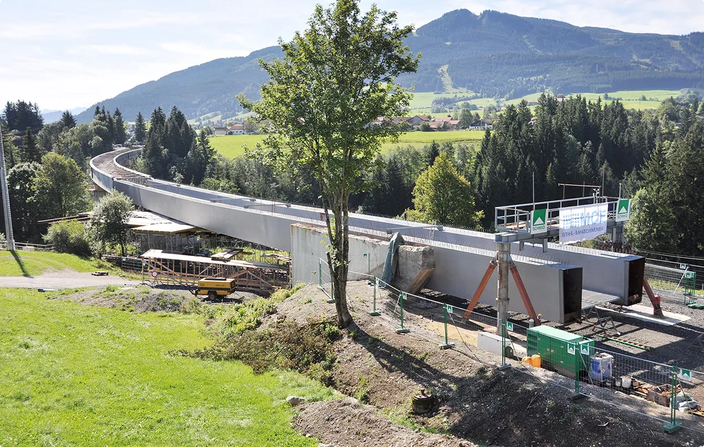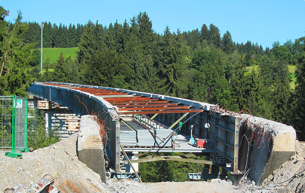Der 50 Jahre alte Wertachtalübergang musste aufgrund des schlechten baulichen Zustandes und seiner eingeschränkten Tragfähigkeit dringend saniert bzw. ertüchtigt werden. Die nachfolgenden Untersuchungen ergaben als wirtschaftlichste Lösung, den Überbau zu erneuern und die bestehenden Unterbauten zu erhalten. Wegen der zwingenden Vorgabe, aus naturschutzfachlichen Gründen Eingriffe in den Talraum der Wertach zu vermeiden, wählte man das innovative Konzept, den neuen Überbau im Taktschiebeverfahren herzustellen und zeitgleich dazu den alten Überbau mit herauszuschieben. Dieses Verfahren wurde in Bayern erstmalig angewandt und erforderte umfangreiche planerische Überlegungen, um die technische Durchführbarkeit des Bauverfahrens sicherzustellen. Vor dem Verschub war es notwendig die bestehende Fahrbahnplatte, bis auf einen Reststreifen über den Stahlträgern, abschnittsweise abzubrechen, um den Überbau zu erleichtern. Außerdem mussten die nach unten sich aufbauenden Lamellenverstärkungen ausgeglichen werden. Die neue Stahlkonstruktion wurde abschnittsweise am Widerlager Kempten montiert und angebaut. Nach dem Verschub des Taktes wurde der folgende Takt angebaut und der Bestandsüberbau am Widerlager Pfronten abgetrennt. Die Besonderheiten des Verfahrens im Gegensatz zum „normalen“ Taktschiebeverfahren waren zum einen die Notwendigkeit eines zweiten Taktkellers zur Demontage des herausgeschobenen Überbaus sowie eine Verschubkonstruktion, die beide Arten von Überbauten gleichzeitig aufnehmen konnte. Die Stahlbaumontage einschließlich dem Abbruch des Bestandes dauerten lediglich 4 Monate.