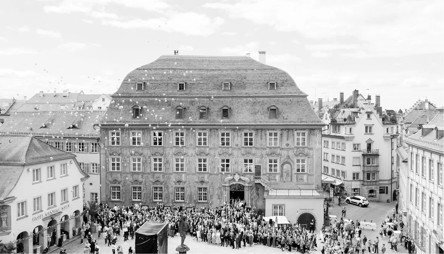 Schneebedeckte Tannen unter einer modernen Betonbrücke mit geschwungenen Bögen und leicht bewölktem Himmel.Berggipfel über einer Wolkendecke bei Sonnenaufgang mit einem Stahlbalkon und einem Gebäude im Vordergrund.Große Menschenmenge vor einem historischen Gebäude mit verzierten Fassaden, umgeben von alten Häusern mit roten Dächern, während gelbe Luftballons in den Himmel steigen.
